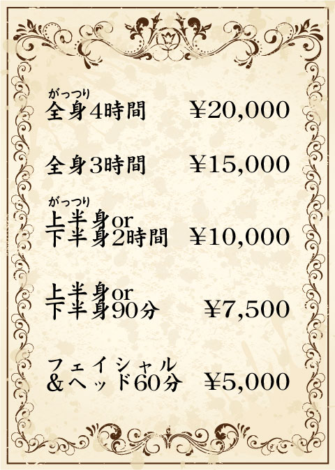 まずは全身の骨格の歪みを視て、頸椎(首)・頭蓋骨・骨盤・股関節・膝関節・肩関節と歪みがある場合は整体を施し、腱・筋療法を行なっていきます。3時間手技のみで施術し、その間遠赤外線マットを下に敷き、湿性電気を上にあてています。ベッドに寝ていられればどなたでも受けられる治療です。※こちらで用意している寝巻きに着替えていただきます。着替えの時間がありますので予約時刻の10分前くらいにお越しください。